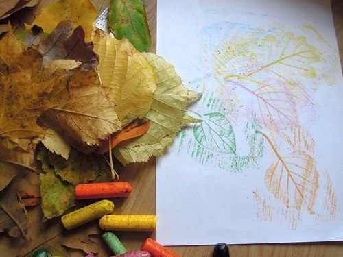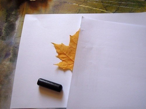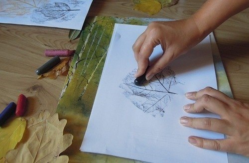 На листочок з дерева кладемо аркуш паперу. Обережними рухами зафарбовуємо листок.